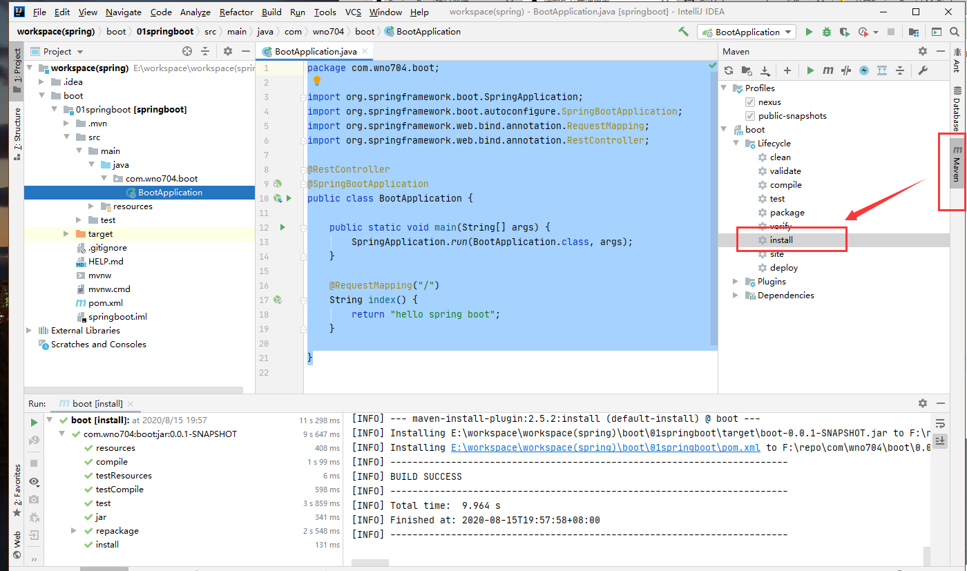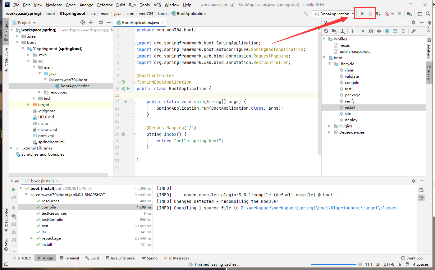项目根目录下生成了一个artifactId+Application命名规则的入口类,为了演示简单,不再新建控制器,直接在入口类中编写代码: