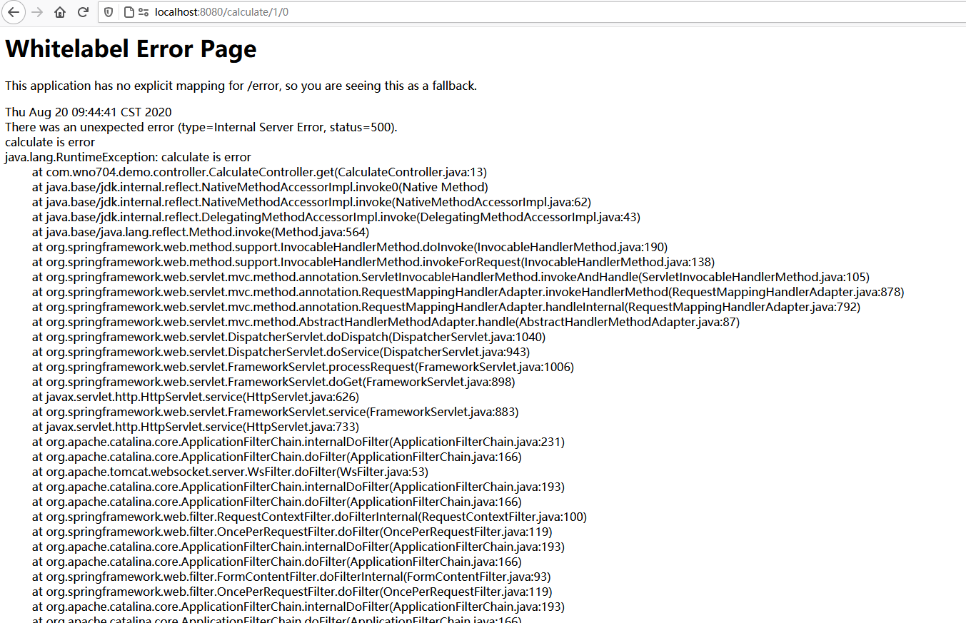 在代码中我们主动的抛出了一个RuntimeException,使用浏览器访问 http://localhost:8080/calculate/1/0 :