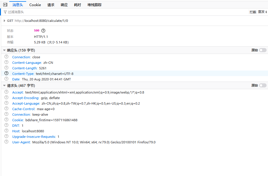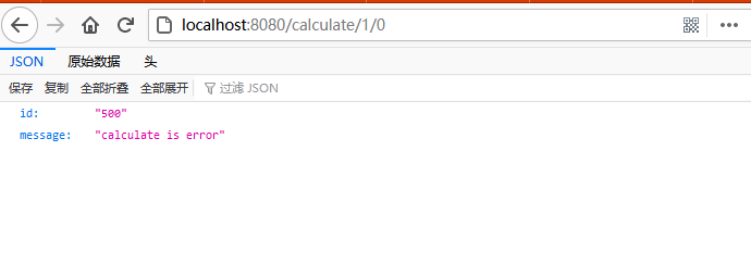 重启项目,再次访问 http://localhost:8080/calculater/1/0 ,响应如下: