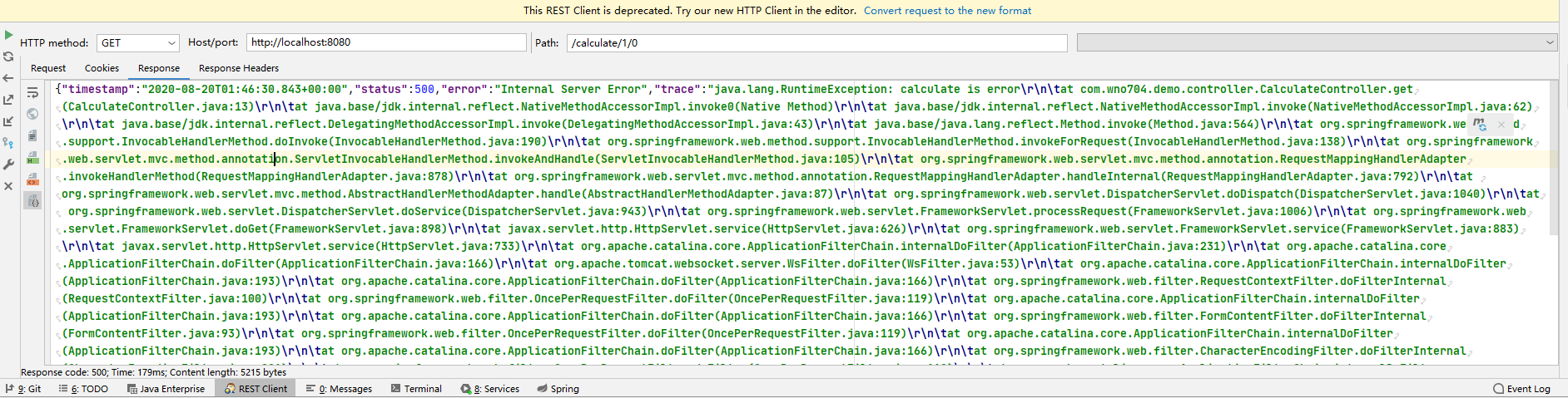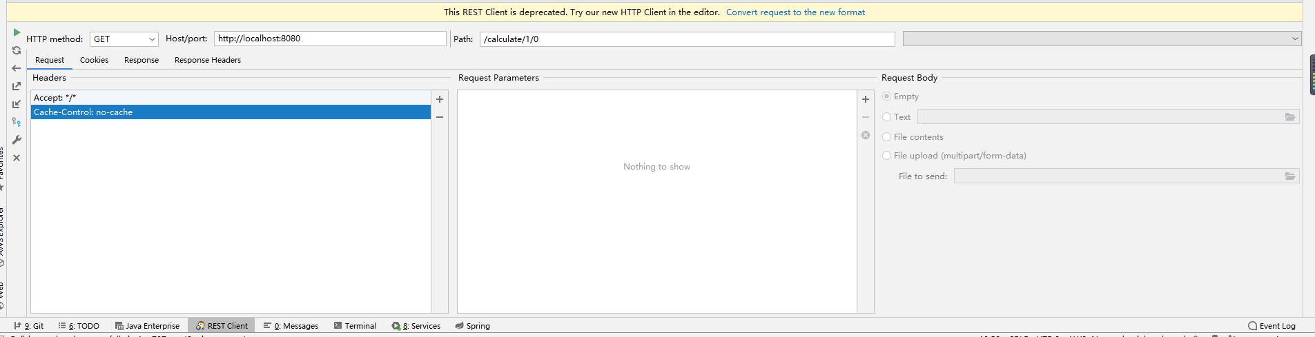 接着使用模拟发送REST请求,使用IDEA插件HTTP Client发送 http://localhost:8080/calculate/1/0 :