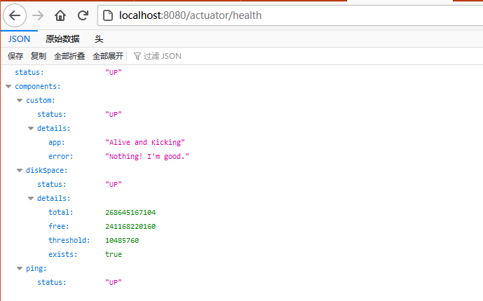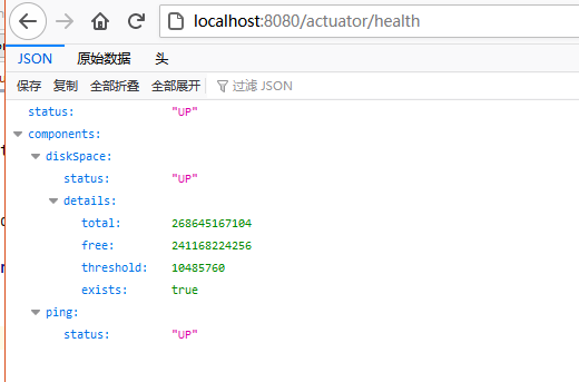 health endpoint只展示了简单的UP和DOWN状态。为了获得健康检查中所有指标的详细信息,你可以通过在application.yaml中增加如下内容: