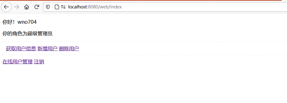 | <!DOCTYPE html> <html xmlns:th="http://www.thymeleaf.org" xmlns:shiro="http://www.pollix.at/thymeleaf/shiro" > <head> <meta charset="UTF-8"> <title>首页</title> </head> <style> div { border: 1px dashed #ddd; padding: 10px; margin: 10px 10px 10px 0px; } </style> <body> <p>你好![[${user.userName}]]</p> <p shiro:hasRole="admin">你的角色为超级管理员</p> <p shiro:hasRole="test">你的角色为测试账户</p> <div> <a shiro:hasPermission="user:user" th:href="@{/user/list}">获取用户信息</a> <a shiro:hasPermission="user:add" th:href="@{/user/add}">新增用户</a> <a shiro:hasPermission="user:delete" th:href="@{/user/delete}">删除用户</a> </div> <a shiro:hasRole="admin" th:href="@{/online/index}">在线用户管理</a> <a th:href="@{/logout}">注销</a> </body> </html>