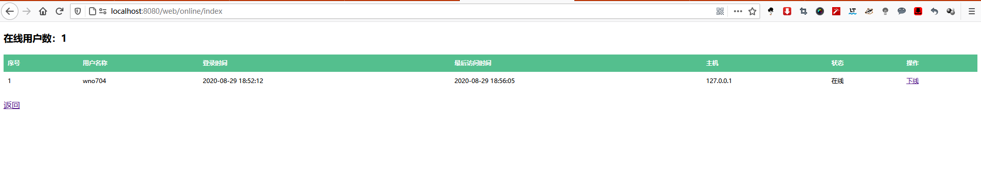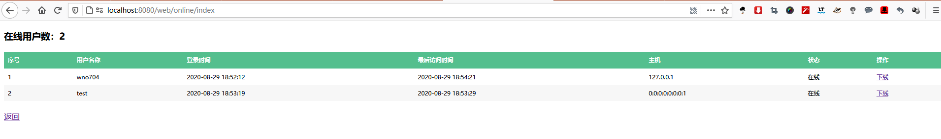 | <!DOCTYPE html> <html xmlns:th="http://www.thymeleaf.org"> <head> <meta charset="UTF-8"> <title>在线用户管理</title> <script th:src="@{/js/jquery-1.11.1.min.js}"></script> <script th:src="@{/js/dateFormat.js}"></script> </head> <body> <h3>在线用户数:<span id="onlineCount"></span></h3> <table> <tr> <th>序号</th> <th>用户名称</th> <th>登录时间</th> <th>最后访问时间</th> <th>主机</th> <th>状态</th> <th>操作</th> </tr> </table> <a th:href="@{/index}">返回</a> </body> <script th:inline="javascript"> var ctx = [[@{/}]]; $.get(ctx + "online/list", {}, function(r){ var length = r.length; $("#onlineCount").text(length); var html = ""; for(var i = 0; i < length; i++){ html += "<tr>" + "<td>" + (i+1) + "</td>" + "<td>" + r[i].username + "</td>" + "<td>" + new Date(r[i].startTimestamp).Format("yyyy-MM-dd hh:mm:ss") + "</td>" + "<td>" + new Date(r[i].lastAccessTime).Format("yyyy-MM-dd hh:mm:ss") + "</td>" + "<td>" + r[i].host + "</td>" + "<td>" + r[i].status + "</td>" + "<td><a href='#' onclick='offline(\"" + r[i].id + "\",\"" + r[i].status +"\")'>下线</a></td>" + "</tr>"; } $("table").append(html); },"json");