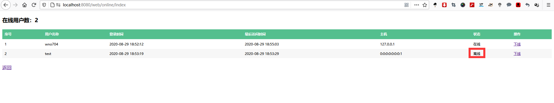 显示的信息符合我们的预期,点击test的下线按钮,强制将其踢出: