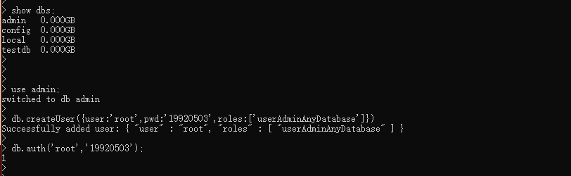 db.createUser({user:'root',pwd:'19920503',roles:['userAdminAnyDatabase']})