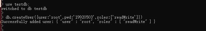 db.createUser({user:'root',pwd:'19920503',roles:['readWrite']})