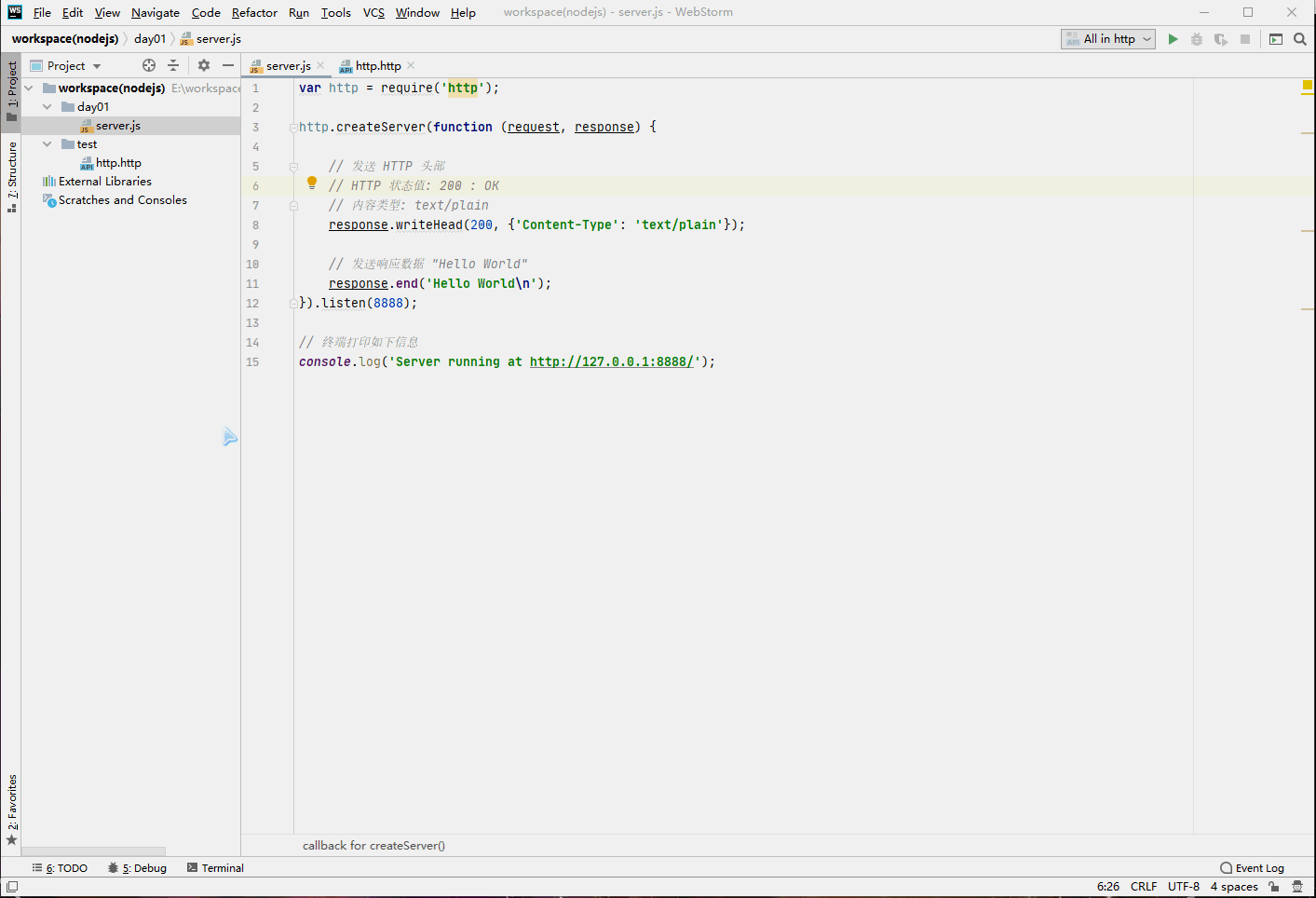 以上代码我们完成了一个可以工作的 HTTP 服务器。