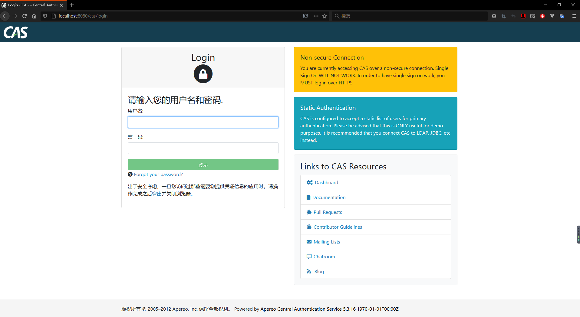 CAS服务器搭建完毕,重启tomcat 进行测试,在浏览器中输入 http://localhost:8080/cas/login 或者 http://localhost:8080/cas ,