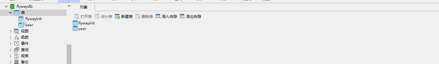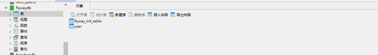 图中,数据库 flywaydb 中创建了 flywayinit 表和 user 表,数据成功迁移到指定数据库中。