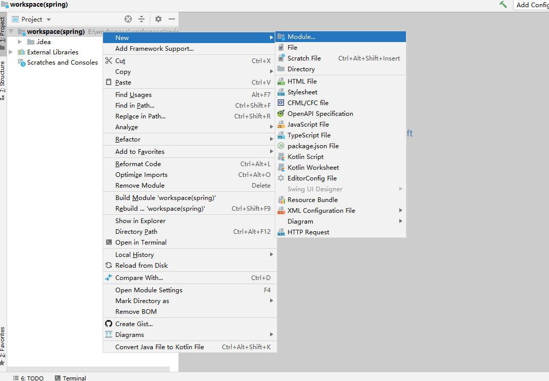 1> 首先创建一个空项目,然后在项目上面鼠标右键选择New->Module,如下图所示: