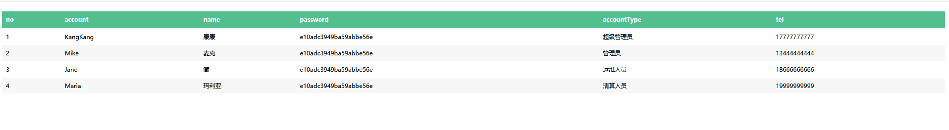 | @Controller public class IndexController { @RequestMapping("/account") public String index(Model m) { List<Account> list = new ArrayList<Account>(); list.add(new Account(1,"KangKang", "康康", "e10adc3949ba59abbe56e", "超级管理员", "17777777777")); list.add(new Account(2,"Mike", "麦克", "e10adc3949ba59abbe56e", "管理员", "13444444444")); list.add(new Account(3,"Jane","简","e10adc3949ba59abbe56e","运维人员","18666666666")); list.add(new Account(4,"Maria", "玛利亚", "e10adc3949ba59abbe56e", "清算人员", "19999999999")); m.addAttribute("accountList",list); return "account"; } }