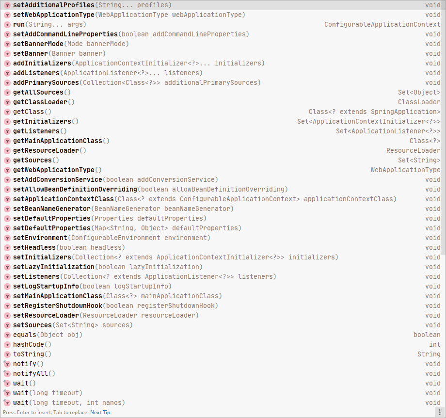 通过调用SpringApplication的方法,我们关闭了Banner的打印,设置应用环境为非WEB应用,profiles指定为dev。除此之外,SpringApplication还包含了许多别的方法,具体可以查看源码或者官方文档: