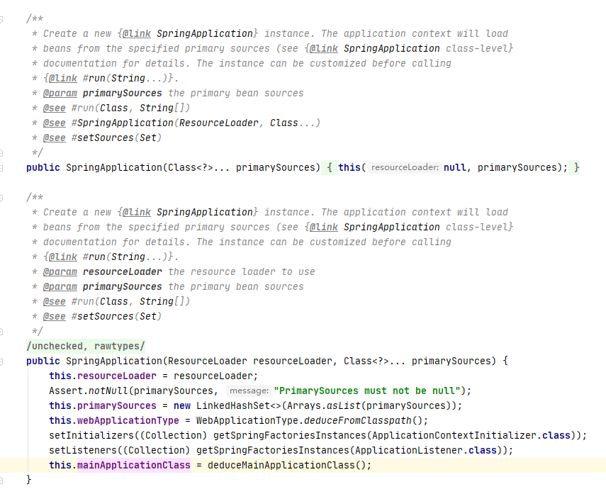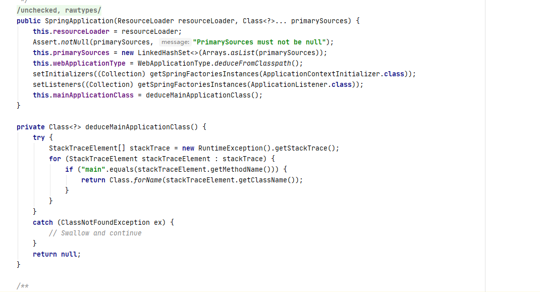 构造器中this.primarySources = new LinkedHashSet<>(Arrays.asList(primarySources));这行代码用于加载我们配置的Spring Boot Bean源。通常我们使用SpringApplication或者SpringApplicationBuilder的构造器来直接指定源。