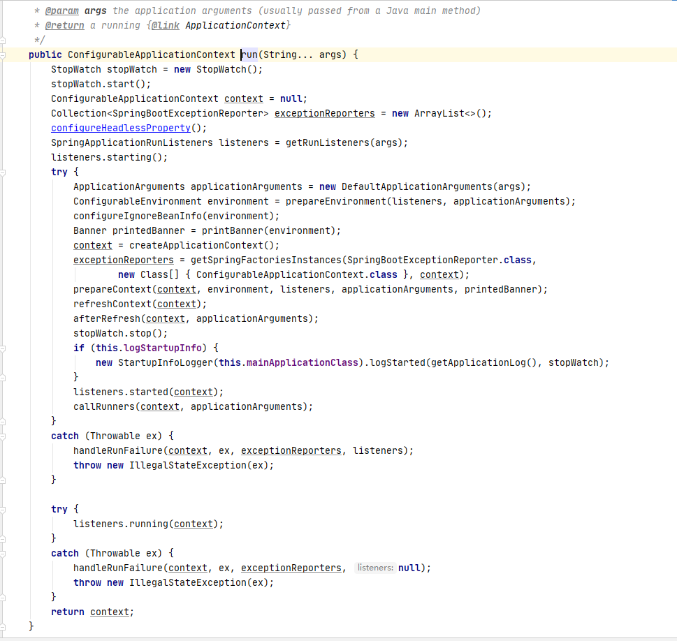 SpringApplication的运行阶段对应SpringApplication的run方法,我们查看其源码: