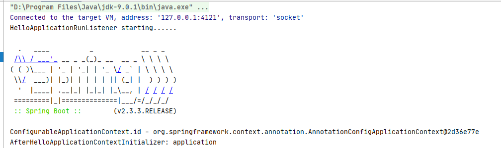 通过这个实现类,我们可以在Spring Boot应用刚启动的时候在控制台输出HelloApplicationRunListener starting......。