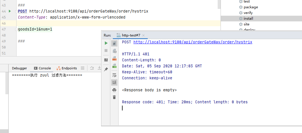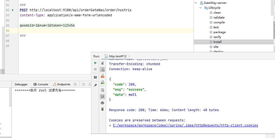 请求订单服务的下单接口( http://localhost:9100/api/orderGateWay/order/hystrix ),携带之前登录接口返回的 token,请求需要执行 zuul 过滤方法,校验通过后路由到订单服务执行之后的操作