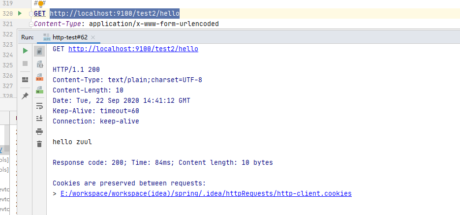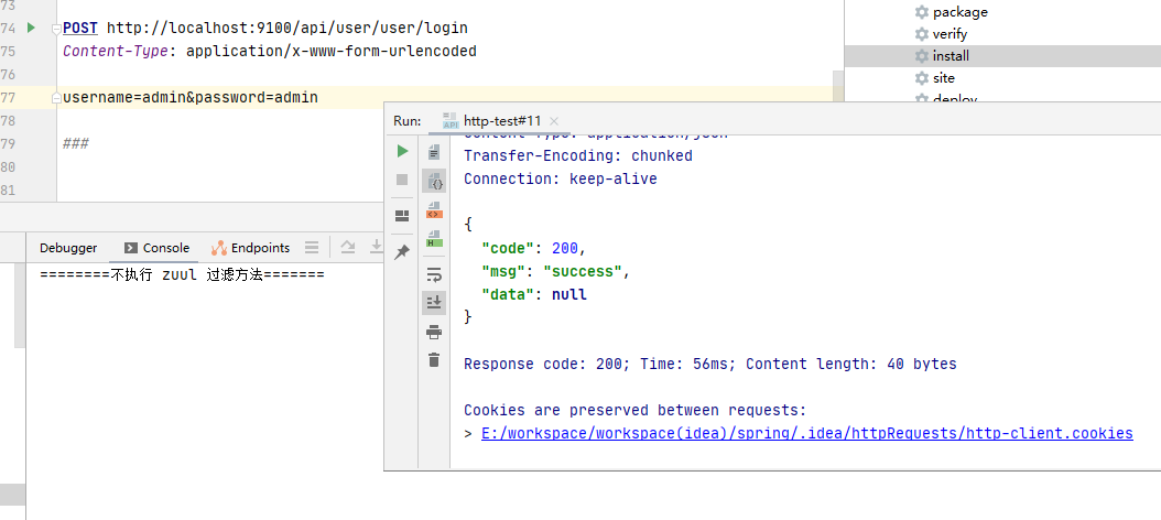 请求用户服务的登录接口( http://localhost:9100/api/user/user/login ),请求不执行 zuul 过滤方法,并且请求响应返回的 cookie 包含 token
