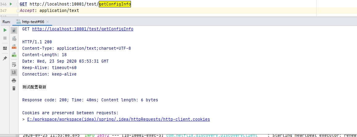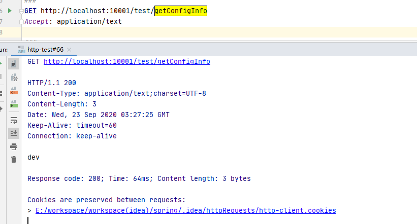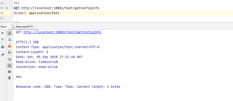 启动成功后,我们在idea的http工具中访问 http://localhost:10001/test/getConfigInfo