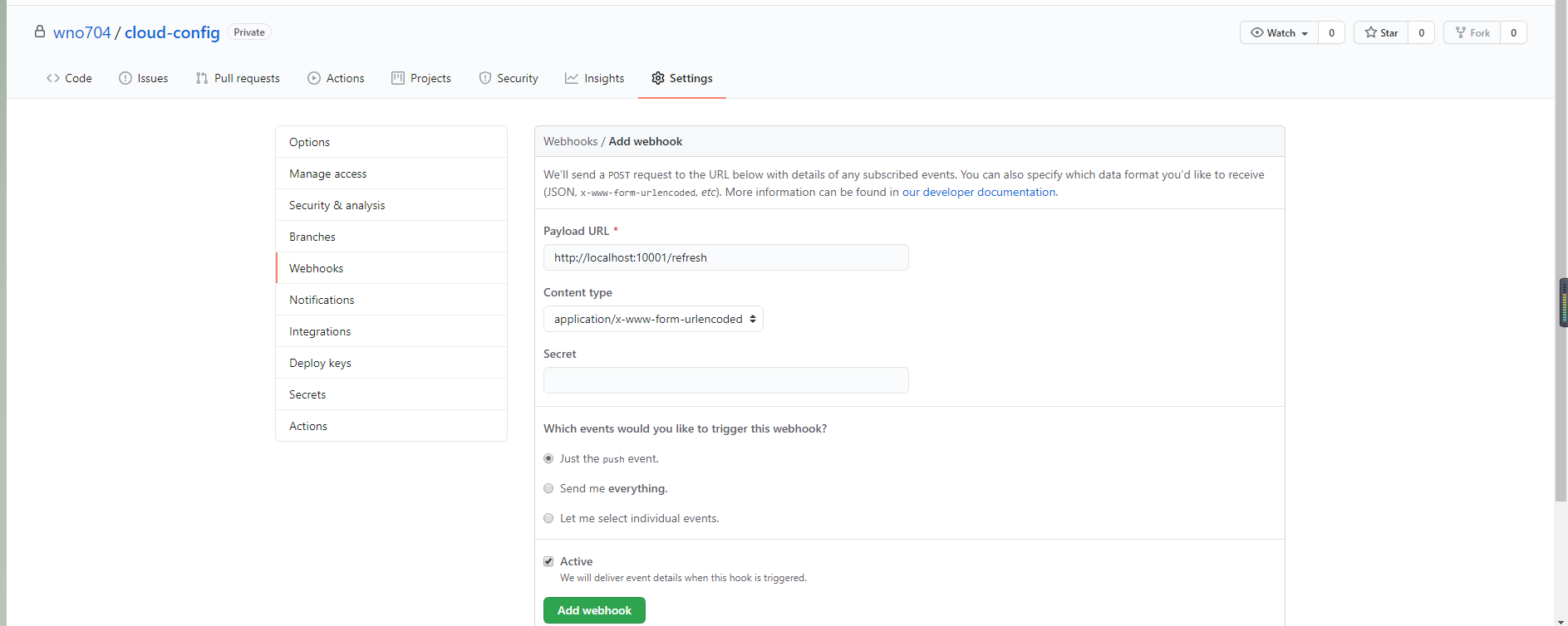 git配置webhooks,URL为 http://localhost:10001/refresh