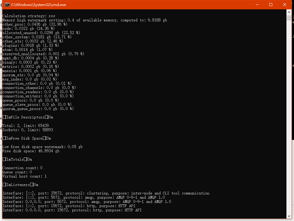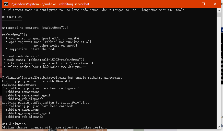 安装插件,命令:rabbitmq-plugins.bat enable rabbitmq_management,出现: