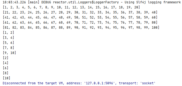Flux.range(1, 100).buffer(20).subscribe(System.out::println);