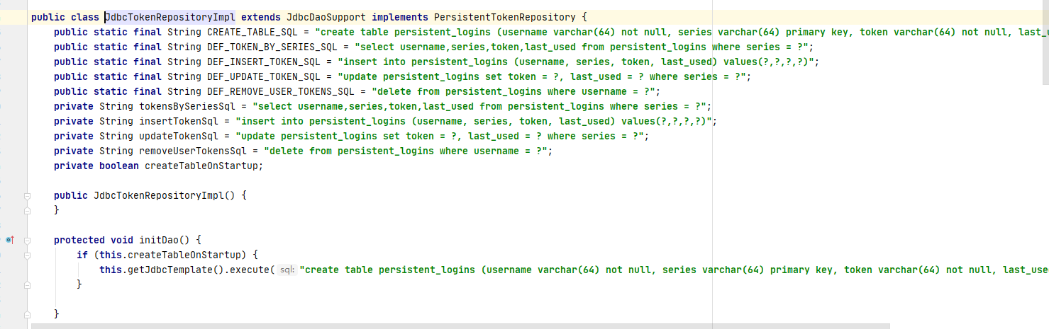 查看JdbcTokenRepositoryImpl的源码,可以看到其包含了一个CREATE_TABLE_SQL属性: