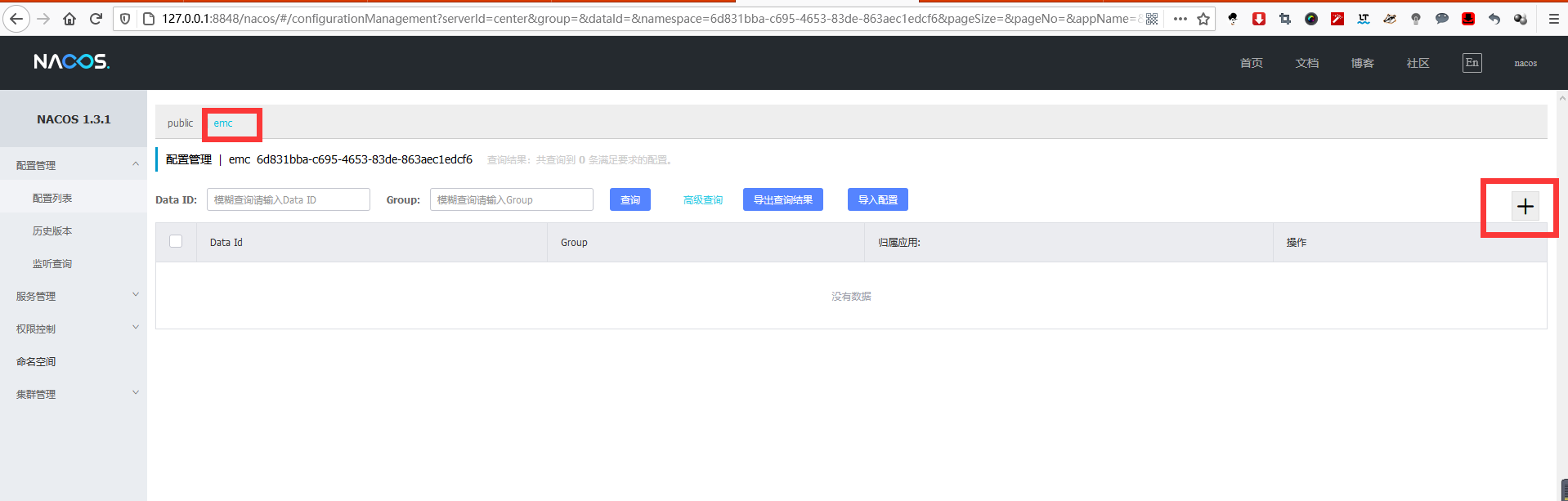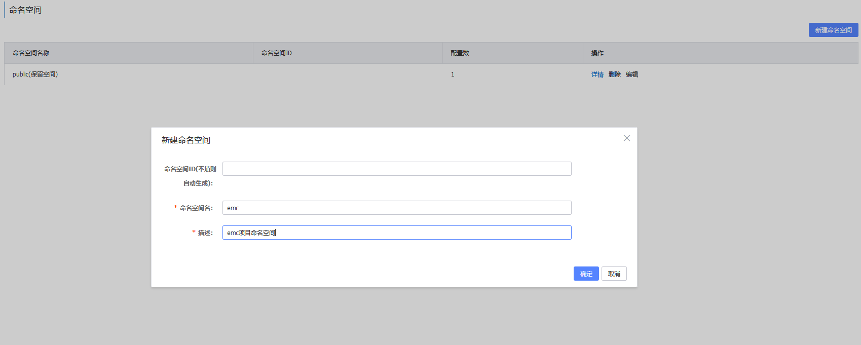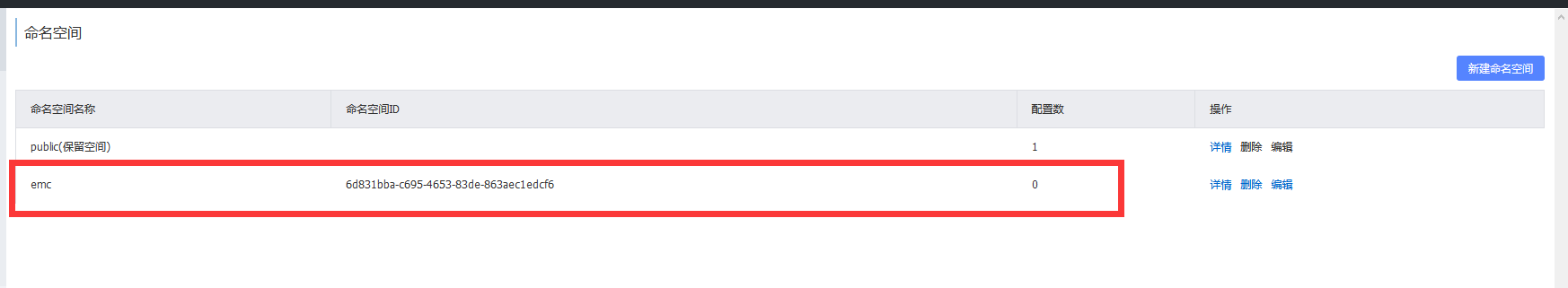 新建emc命名空间后,如果增加时候,不填写命名空间id,会生成一个唯一标识该命名空间的命名空间id:6d831bba-c695-4653-83de-863aec1edcf6。