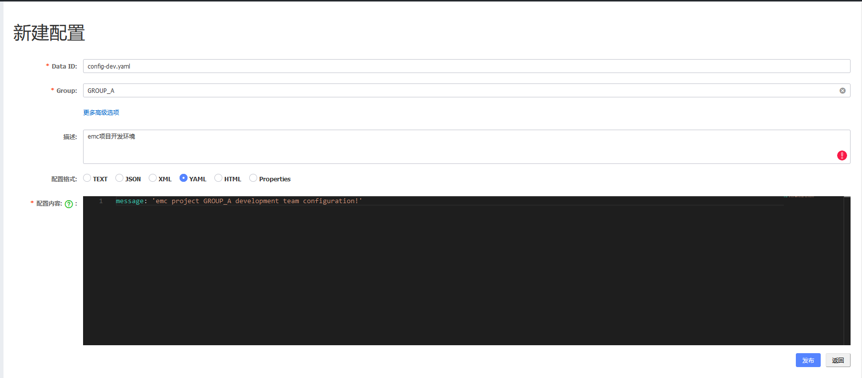 假如现在GROUP_A组的组长需要在Nacos中新建一个开发环境的emc项目配置,那么他可以这样做: