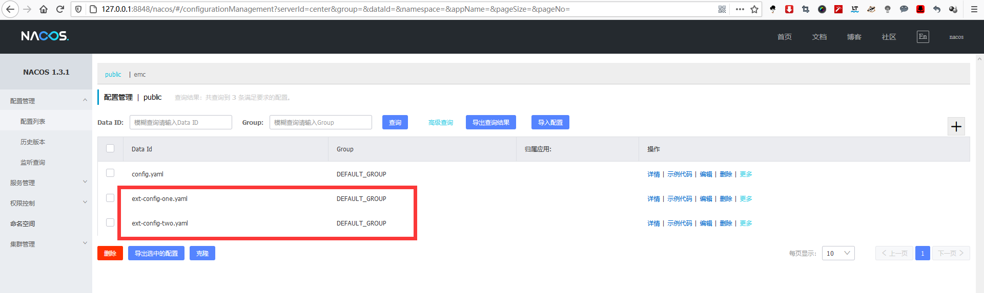 上面的配置中,我们分别从DEFAULT_GROUP中获取了ext-config-one.yaml和ext-config-two.yaml配置内容,并且ext-config-one.yaml支持刷新,ext-config-two.yaml不支持刷新。