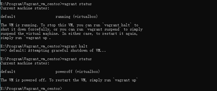我们先用vagrant status命令查看一下虚拟机的状态、我们可以执行vagrant halt来关闭虚拟机: