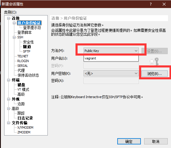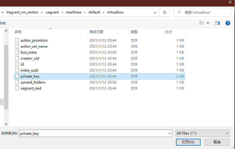添加公钥,默认路径在虚拟机的安装目录下面 .vagrant\machines\default\virtualbox目录下