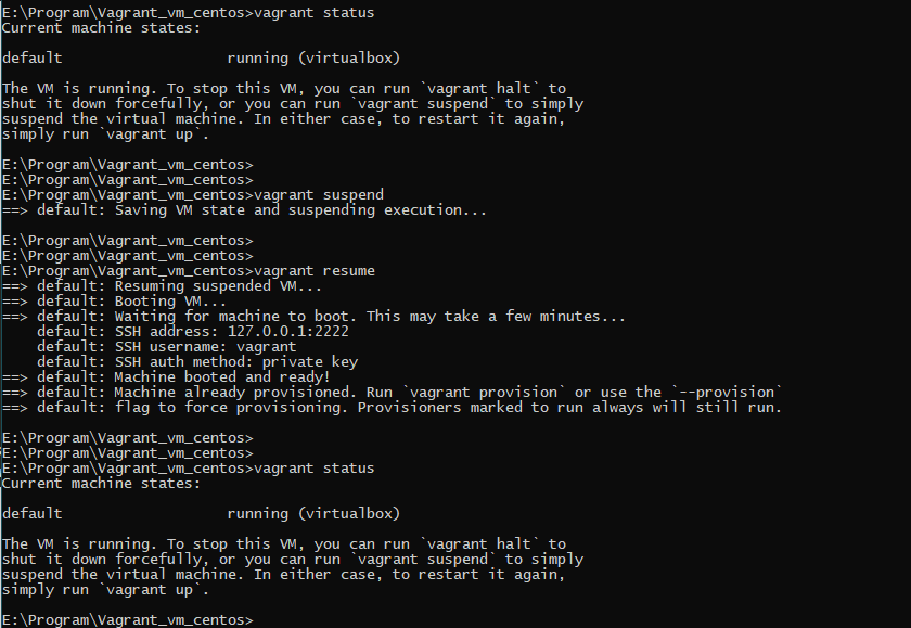 启动虚拟机的命令为vagrant up,我们也可以使用vagrant suspend命令来暂停运行中的虚拟机,以保持它的运行状态。暂停后可以使用vagrant resume命令来恢复虚拟机: