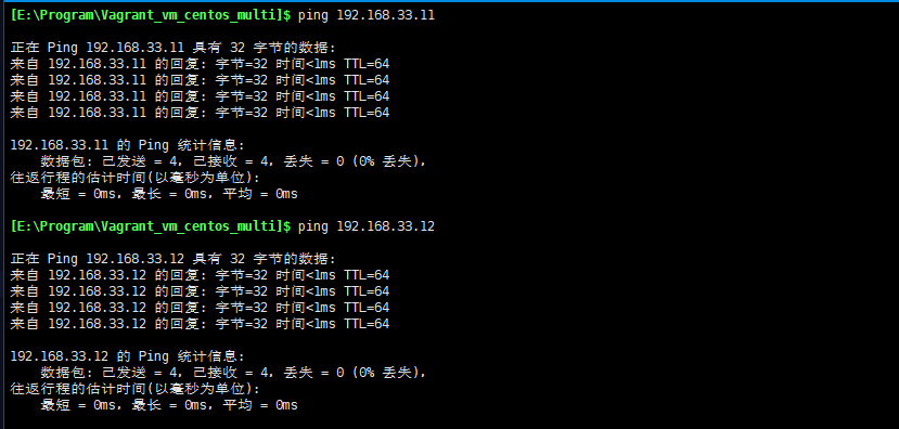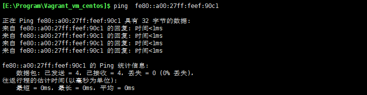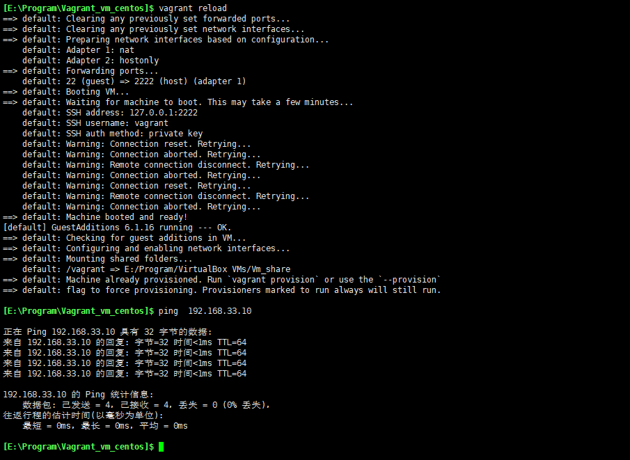 然后使用命令vagrant reload重启虚拟机,重启后我们使用ping命令看是否可以在windows上访问到这个ip: