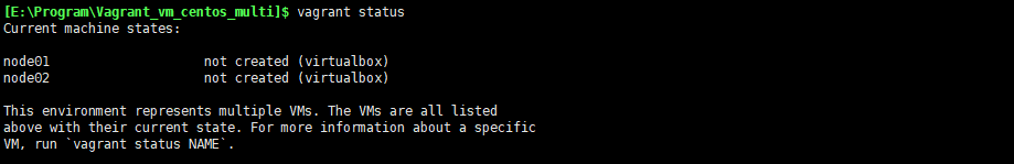 启动后(第一次启动耗时可能比较长),使用vagrant status来查看它们的状态:
