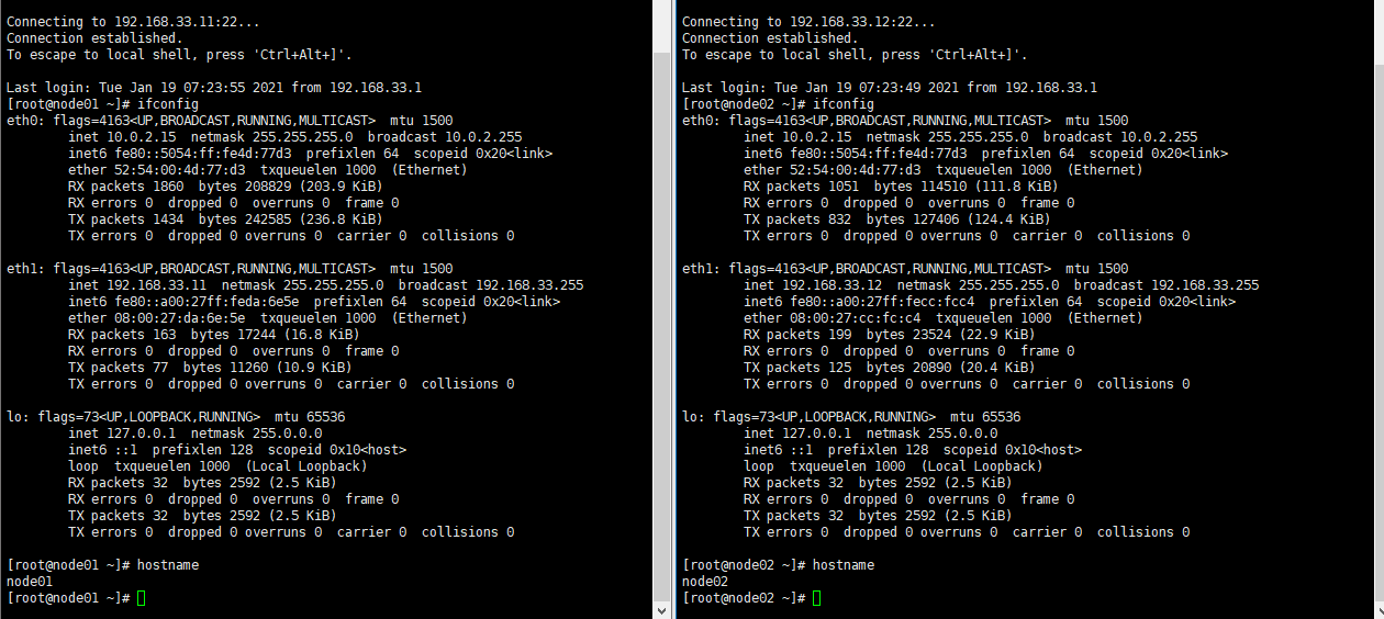 配置好后重启这两台虚拟机,然后分别连接这两台虚拟机,看是否能够ping通: