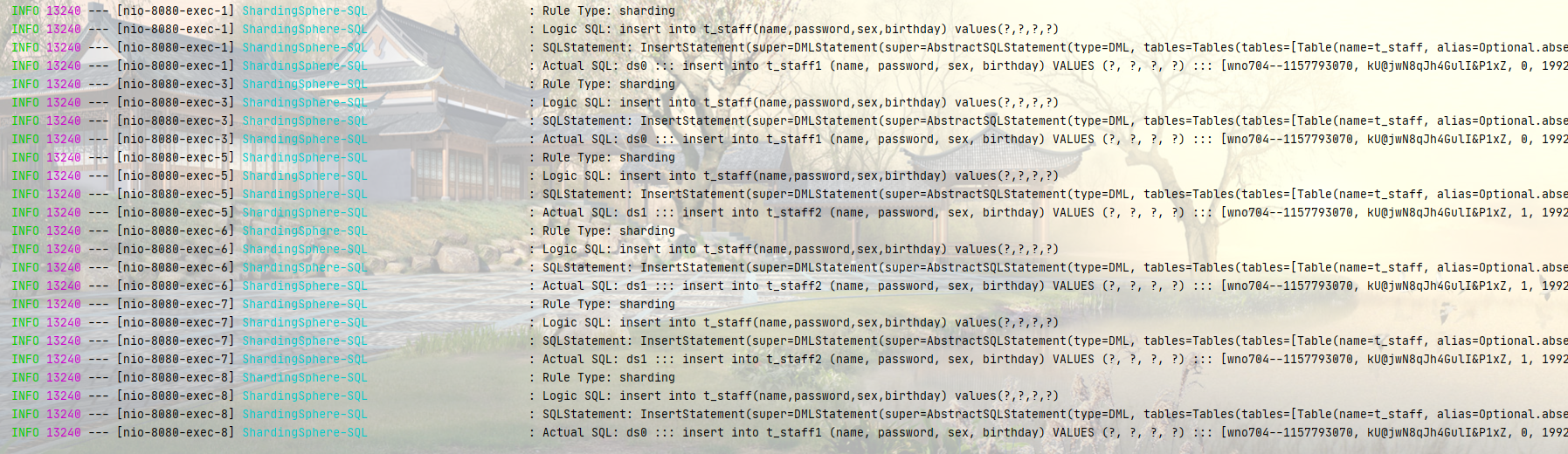 通过上面日志发现,根据sex的不同,数据分别插入到不同的数据源、不同的表里面。在我们查询时候,sql语句查询是逻辑表,实际查询了所有的表。