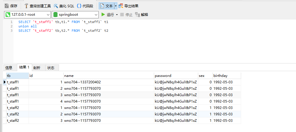 通过上面分析发现birthday为2021会选择数据源ds1,2019会选择数据源ds0。sex为1会保存到t_staff2表,2会保存到t_staff1表里。