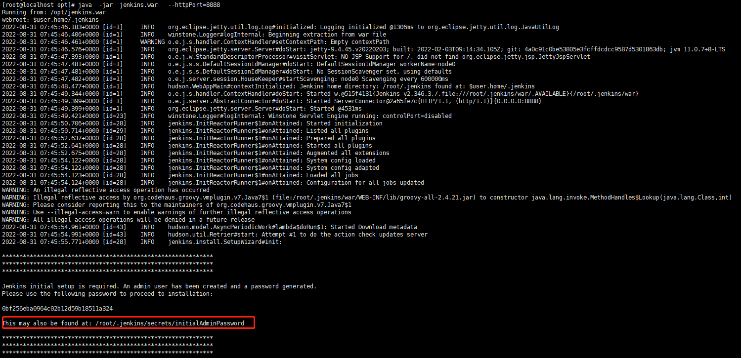 如提示路径,或者启动成功后日志中提示,从服务器上获取初始密码。