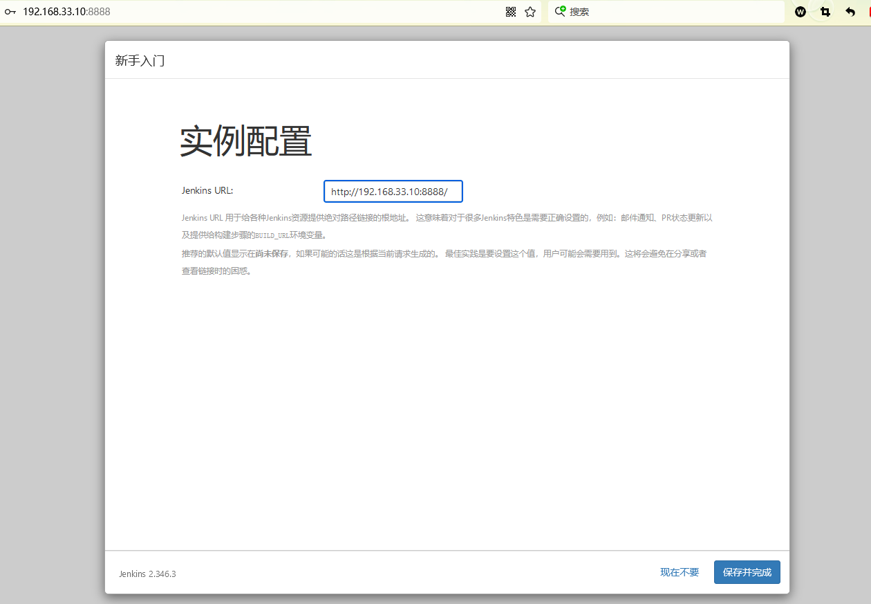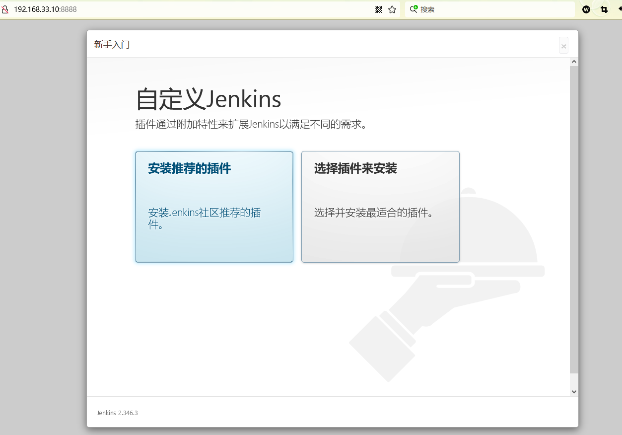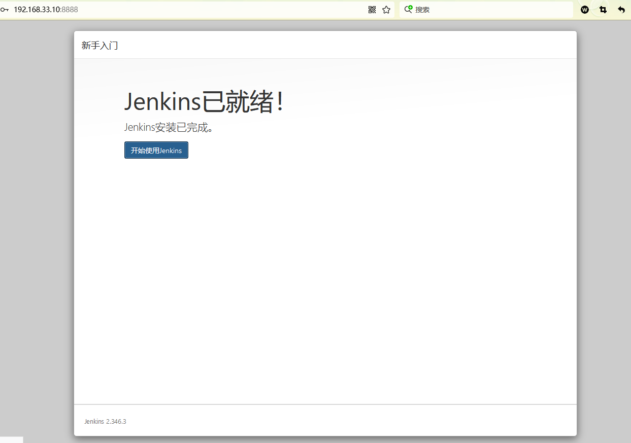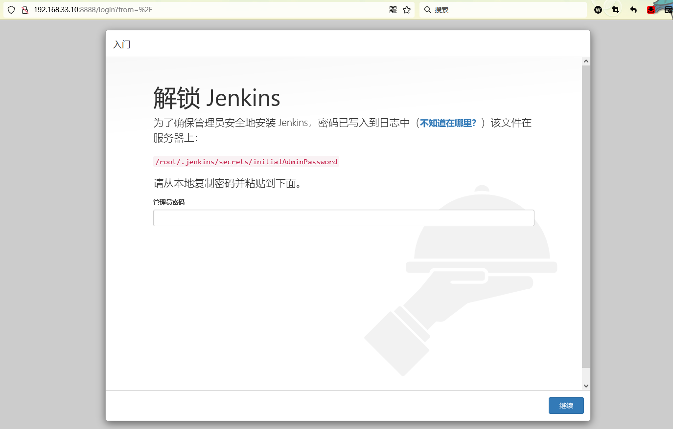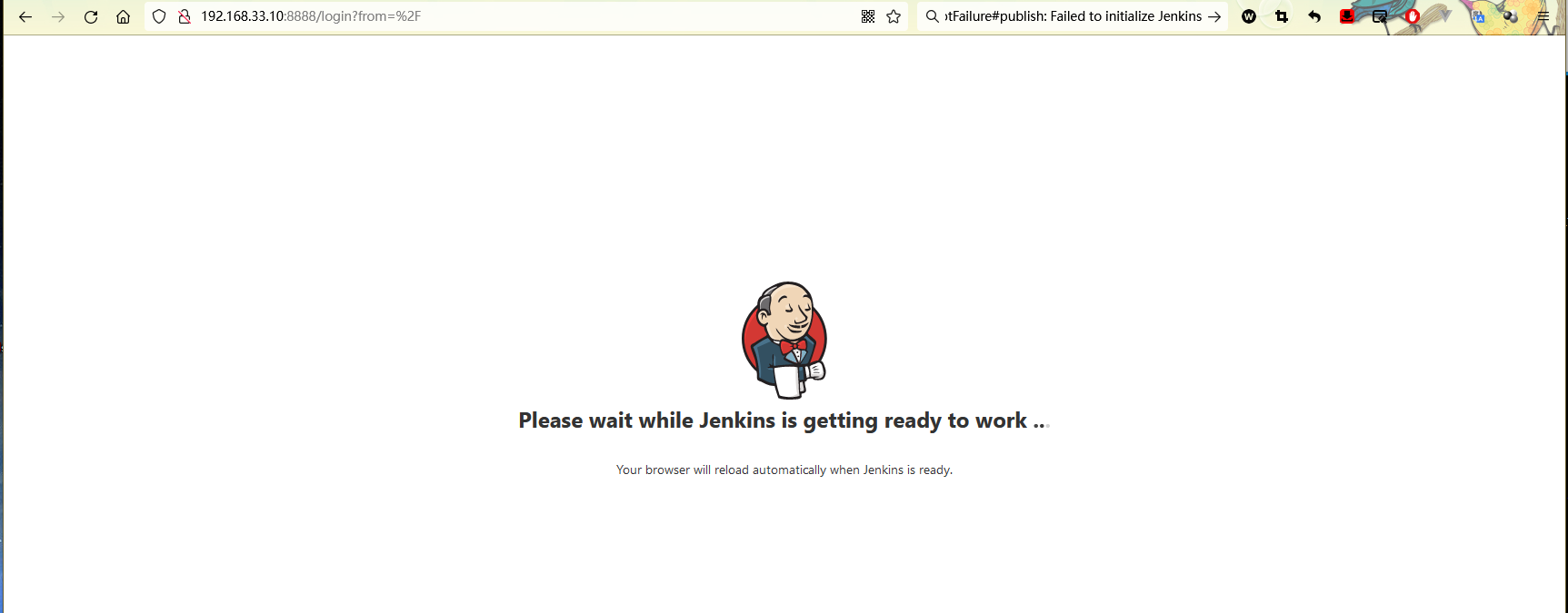 浏览器访问,由于我本地在虚拟机中部署,IP为:192.168.33.10,启动时候指定了端口8080,访问地址为: http://192.168.33.10:8008 ,第一次访问显示如下,需要稍等片刻。