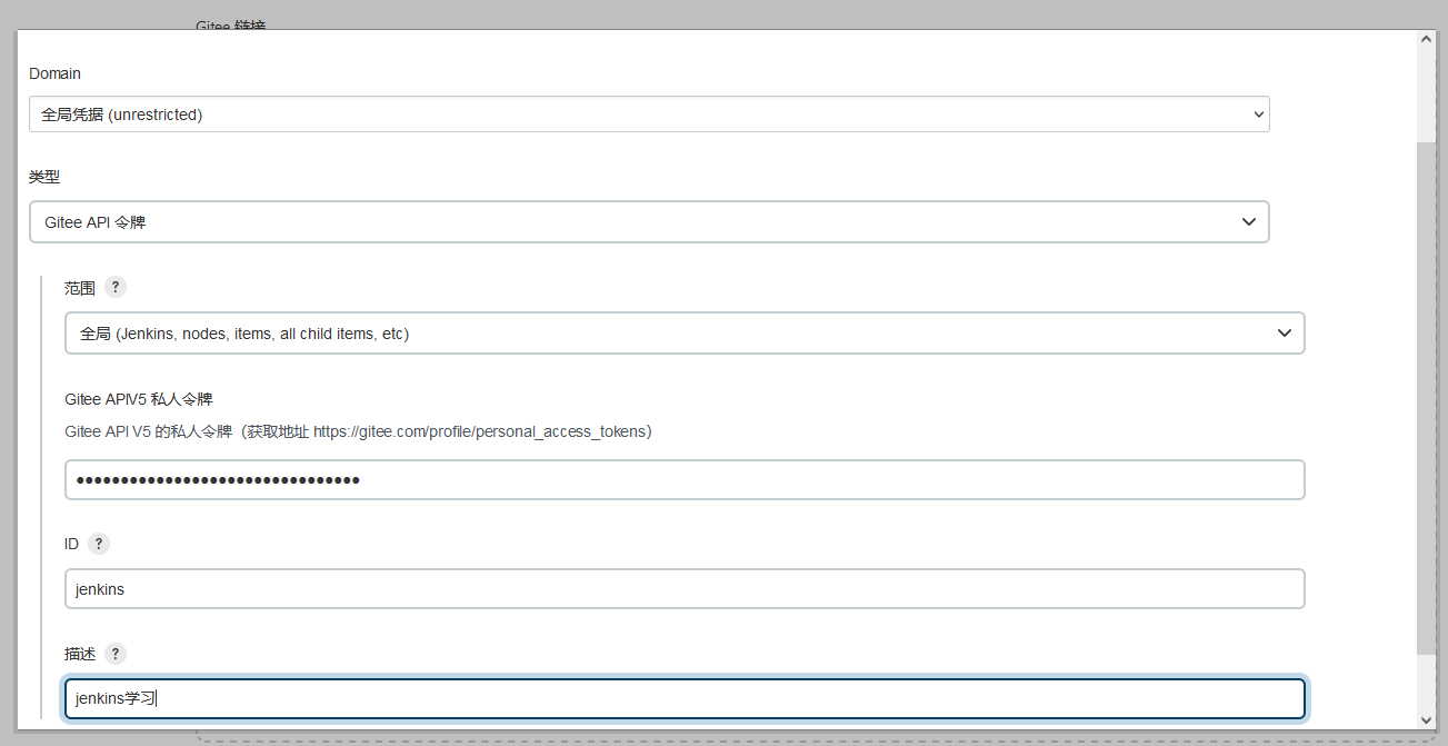 范围:根据你个人想要这个凭据在哪个范围可使用,我选的是全局