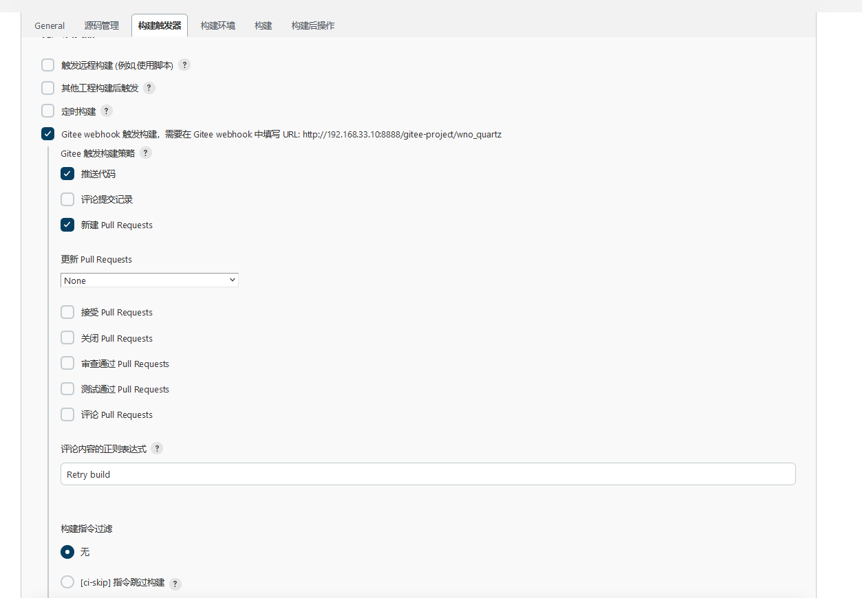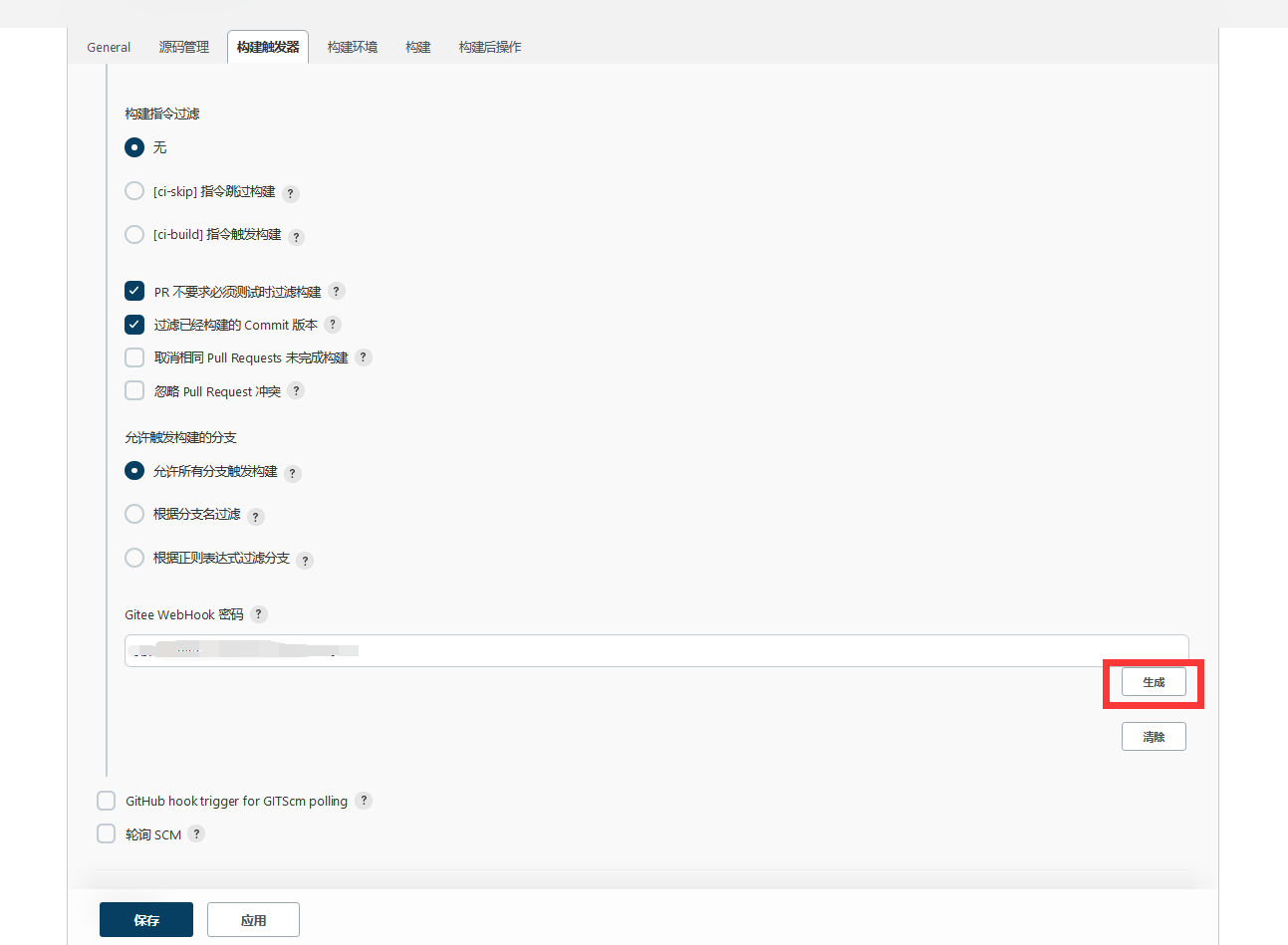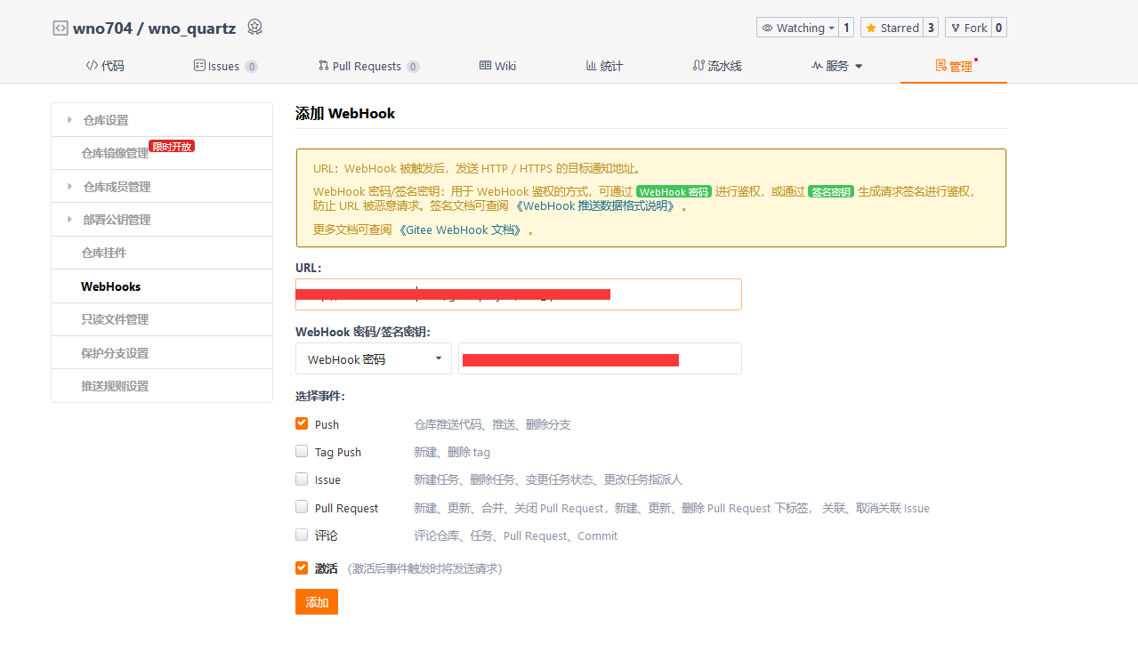 点击【生成】按钮,将生成的密码贴到gitee项目中的webHook密码,如下所示: