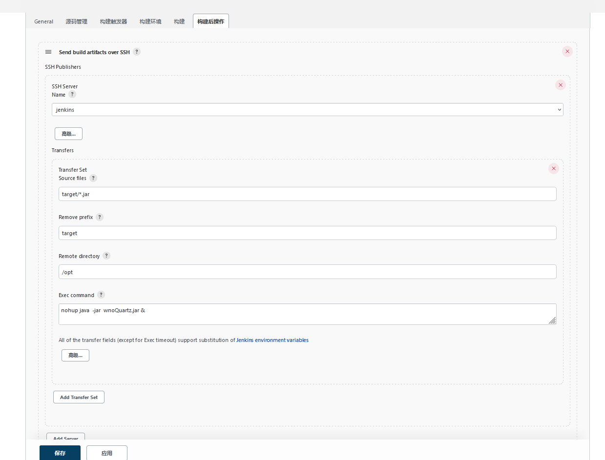 1.构建后操作的意思是,jar打包好后,要将jar/war发送到哪里服务器,发送后和启动等操作。