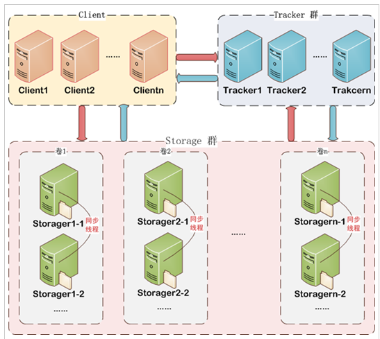 FastDFS 架构包括 Tracker Server 和 Storage Server。客户端请求 Tracker Server 进行文件上传、下载,通过 Tracker Server 调度最终由 Storage Server 完成文件上传和下载。