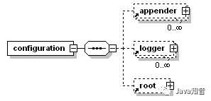 logback.xml配置文件的基本结构可以描述为元素,包含零个或多个元素,后跟零个或多个元素,后跟最多一个元素(也可以没有)。下图说明了这种基本结构: