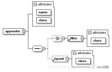 appender使用元素配置,该元素采用两个必需属性name和class。 name属性指定appender的名称,而class属性指定要实例化的appender类的完全限定名称。 元素可以包含零个或一个元素,零个或多个元素以及零个或多个元素,下图说明了常见的结构: