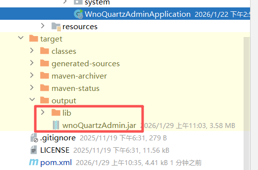 由于根据以上的pom文件,打包会将自己的代码成一个干净的 xxx.jar(仅包含 .class、资源等,不含依赖);三方依赖打包输出到 lib/ 子目录中,便于管理、替换、升级。这样我们每次升级只需要替换自己的xxx.jar就可以了。
